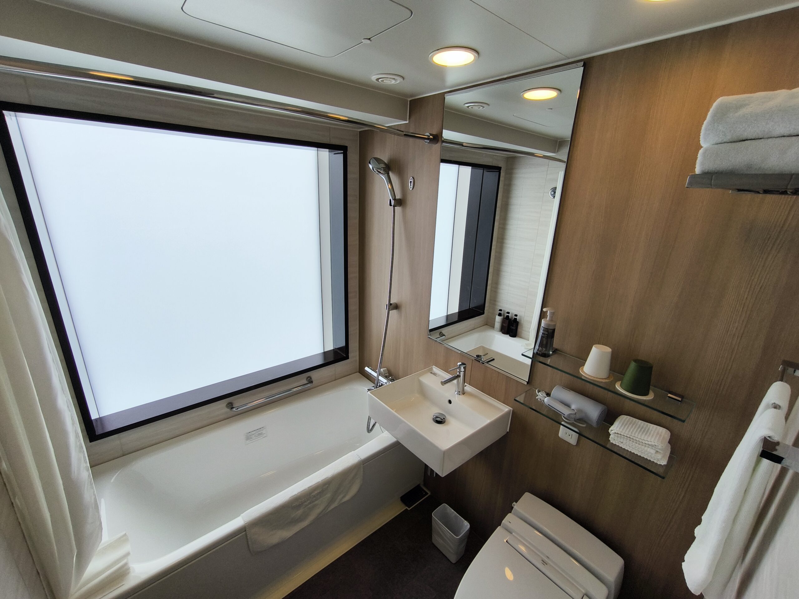 - 客室に関しては、大きな変更点は、①電源カードホルダーシステム (電源制御) の廃止 (ワイドスイッチに変更され、カード置場が新設) され、②シャワー水圧が格段に強くなりました。また、INAXの多機能シャワーヘッドは、スプレー、マッサージ、ミストの3つの吐水モードがあり、非常に心地良いバスタイムを過ごせました (動画撮影を忘れました)。