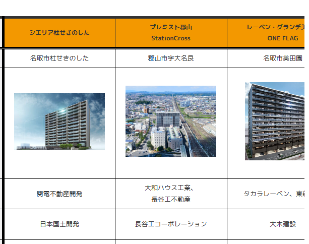 | プレミスト郡山 StationCross | レーベン・グランデ美田園 ONE FLAG | プラウドタワー郡山 | レーベン福島 ONE TOWER | グランフォセット福島上町 | アルファステイツ名取大手町 | デュオヒルズ麓山ザ・レジデンス | (仮称) プラウド福島 | |||