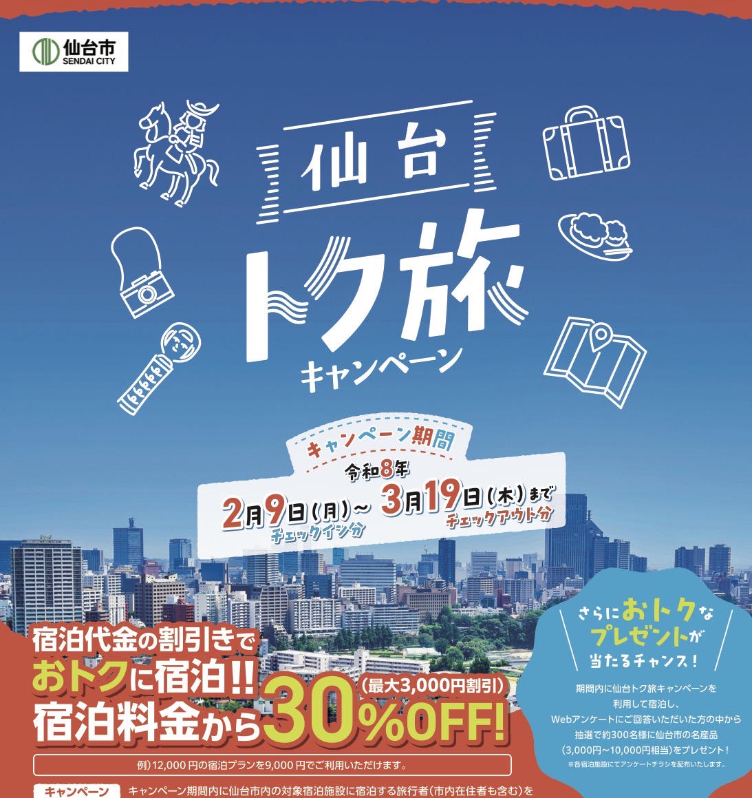 - 注意事項: 仙台トク旅の専用プランであること、宿泊代金により宿泊税の課税対象となること、連泊の場合は3日まで適用、出張利用可など
